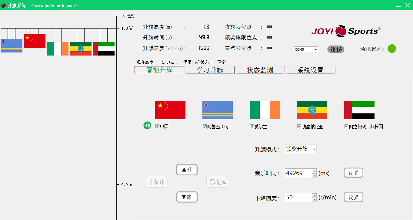 2. 智能學(xué)習(xí)模塊:自動(dòng)完成不同場(chǎng)館高度下的升旗自動(dòng)匹配,簡(jiǎn)化前期調(diào)試時(shí)間,升旗速度與國(guó)歌時(shí)長(zhǎng)自適應(yīng)